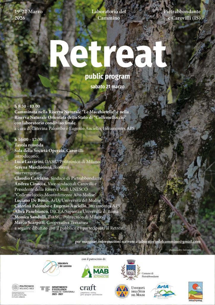 Sabato 21 marzo, nelle splendide cornici di Carovilli e Pietrabbondante, si svolgerà l’evento Retreat, organizzato dal Laboratorio del Cammino in collaborazione con il Centro ArIA. Si riporta di seguito la locandina completa dell’evento.